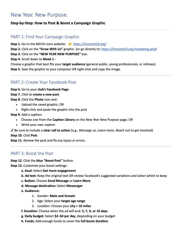 Every MD19 club — and Lion — with a Facebook or Instagram account can participate by posting ost 1 or 2 (or more!) ads per week throughout January.